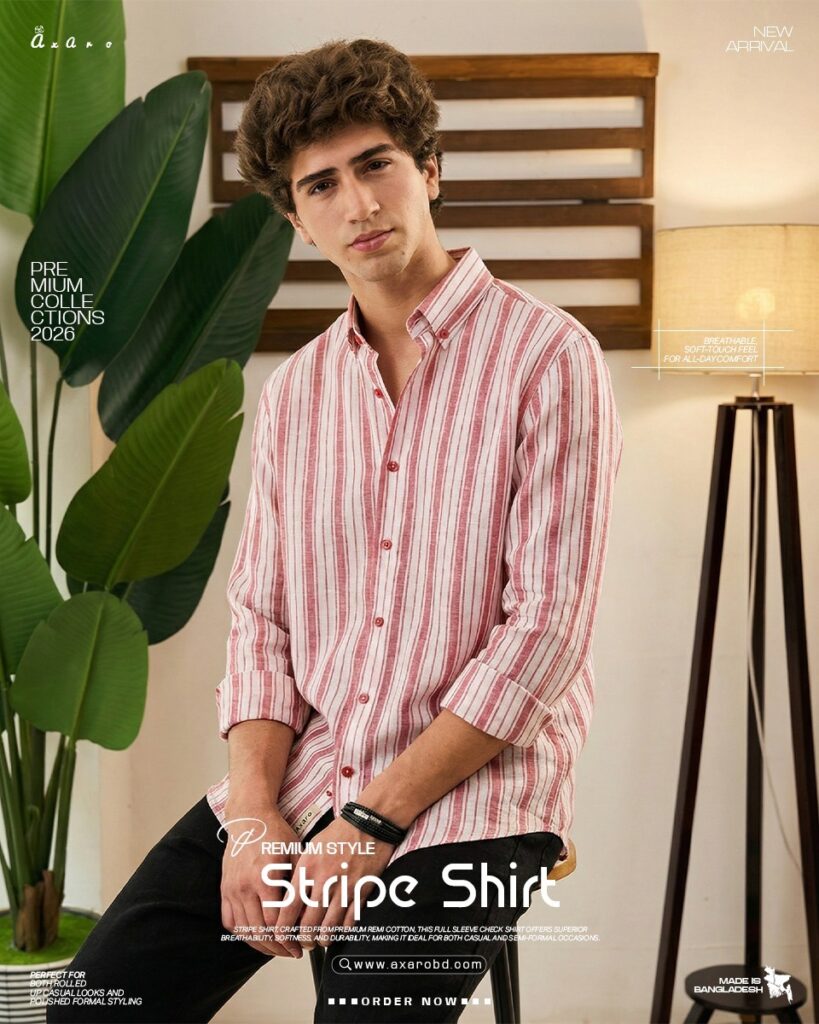 Candy Apple Stripe Shirt, Crafted from premium remi cotton, this full sleeve check shirt offers superior breathability, softness, and durability, making it ideal for both casual and semi-formal occasions.